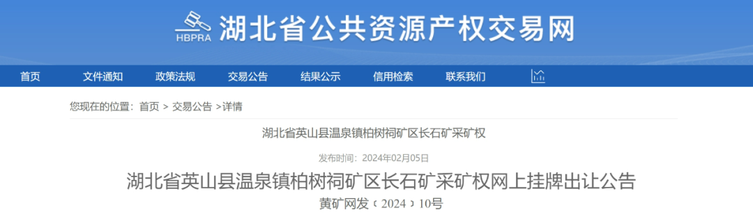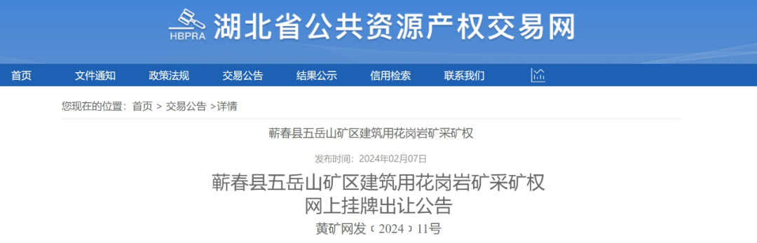 該礦位于英山縣溫泉鎮(zhèn)柏樹祠村,礦區(qū)面積0.35平方公里,開采礦種為長石礦、建筑石料礦(建筑用花崗巖、建筑用片麻巖)。礦區(qū)范圍內(nèi)資源儲量共4840.1萬噸(建筑用石料礦資源量4801.3萬噸,長石礦38.8萬噸),生產(chǎn)規(guī)模484萬噸/年(建筑石料礦480萬噸/年、長石礦4萬噸/年),出讓年限10年,起始價(jià)8337萬元。網(wǎng)上掛牌起止時(shí)間2024年3月9日-2024年3月25日。