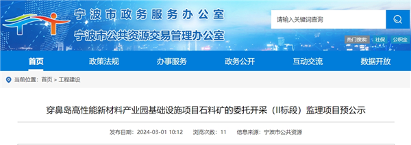 日前,浙江省寧波市公共資源交易管理辦公室發(fā)布了穿鼻島高性能新材料產(chǎn)業(yè)園基礎(chǔ)設(shè)施項(xiàng)目石料礦的委托開采(II標(biāo)段)監(jiān)理招標(biāo)文件預(yù)公示。