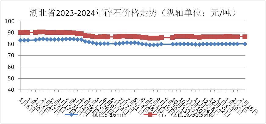 監(jiān)測(cè)數(shù)據(jù)顯示:2月份,碎石(粒徑5-16mm)、碎石(粒徑17-31.5mm)全省均價(jià)分別為80.15元/噸、86.50元/噸,環(huán)比分別下跌:0.06%、0.01%;同比分別下跌:4.76%和4.40%。具體價(jià)格走勢(shì)情況如下圖: