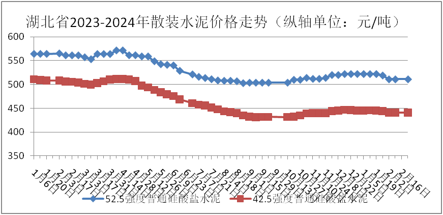 監(jiān)測(cè)數(shù)據(jù)顯示:2月份,42.5強(qiáng)度普通硅酸鹽水泥、42.5強(qiáng)度礦渣硅酸鹽水泥、52.5強(qiáng)度普通硅酸鹽水泥全省平均價(jià)格分別為:440.91/噸、424.05元/噸、511.00元/噸,環(huán)比分別下跌:0.90%、2.50%、1.97%;同比分別下跌:12.87%、15.09%、9.07%。具體價(jià)格走勢(shì)情況如下圖: