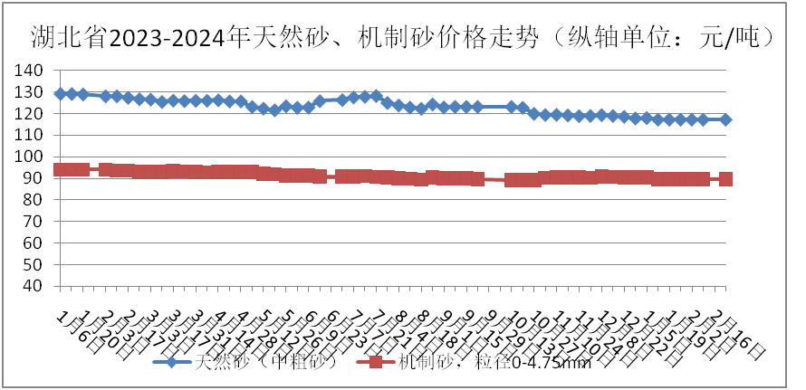 監(jiān)測(cè)數(shù)據(jù)顯示:2月份,天然砂(中粗砂)、機(jī)制砂全省均價(jià)分別為117.33元/噸、89.70元/噸,環(huán)比分別下跌:0.16%、0.19%;同比分別下跌:8.08%、4.06%。具體價(jià)格走勢(shì)情況如下圖: