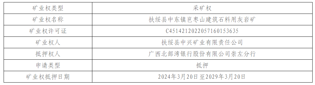 據(jù)廣西崇左扶綏縣人民政府消息,扶綏縣中興礦業(yè)有限責任公司抵押一條年產(chǎn)300萬噸建筑石料用灰?guī)r礦生產(chǎn)線,項目總投資5000萬元,礦區(qū)面積0.1615平方公里,開采的年限為11年。抵押權(quán)人:廣西北部灣銀行股份有限公司崇左分行,礦業(yè)權(quán)抵押日期:2024年3月20日至2029年3月20日。