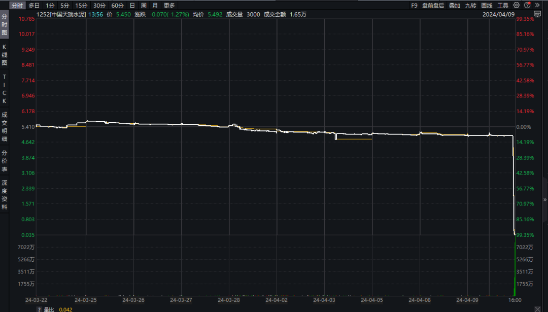 9日,中國水泥巨頭天瑞集團(tuán)在港股收盤前突然閃崩,股價暴跌99%,總市值只剩港幣1.4億元。一天內(nèi)蒸發(fā)145.48億元。從4.92港元/股跌至收盤價0.048港元/股。而在此之前,中國天瑞水泥股價表現(xiàn)平穩(wěn),交易稍顯清淡。