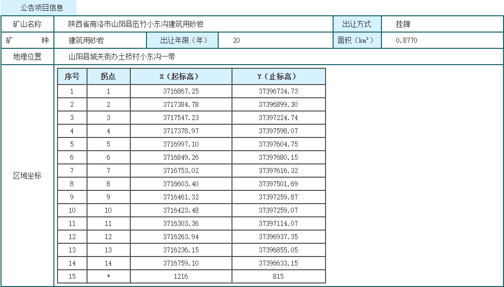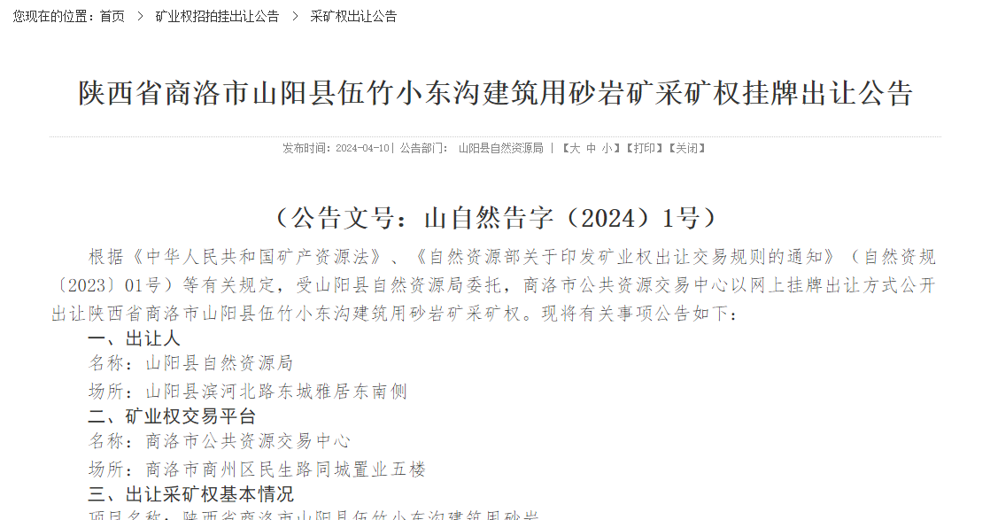 陜西省商洛市山陽(yáng)縣伍竹小東溝建筑用砂巖礦采礦權(quán)掛牌出讓公告