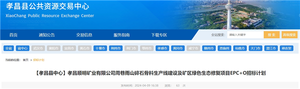 4月9日,湖北省孝昌縣公共資源交易中心發(fā)布孝昌順明礦業(yè)有限公司周巷雨山碎石骨料生產(chǎn)線建設(shè)及礦區(qū)綠色生態(tài)修復(fù)項(xiàng)目EPC+O招標(biāo)計(jì)劃。