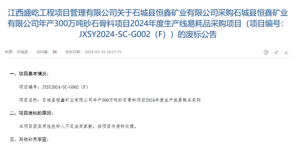日前,江西省贛州市石城縣鑫礦業(yè)有限公司年產(chǎn)300萬噸砂石骨料項目2024年度生產(chǎn)線易耗品采購作廢。該項目成為廢標的原因是因?qū)嵸|(zhì)性投標人不足法定家數(shù)。