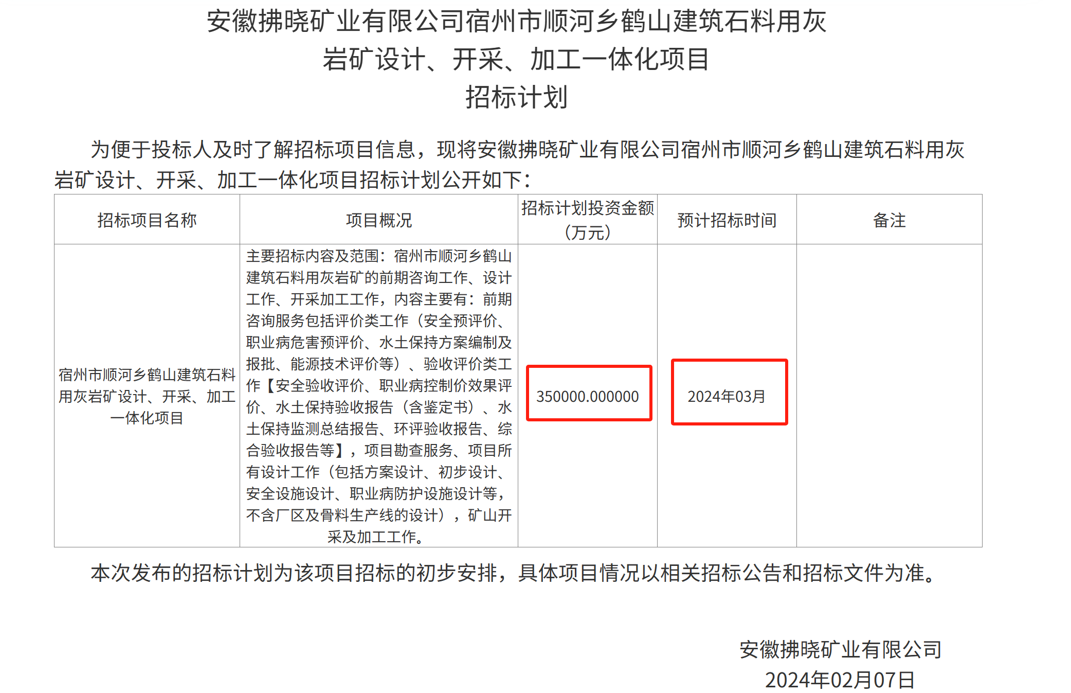 據(jù)了解,2024年2月,就曾發(fā)布宿州市順河鄉(xiāng)鶴山建筑石料用灰?guī)r礦設(shè)計(jì)、開采、加工一體化項(xiàng)目招標(biāo)計(jì)劃,招標(biāo)計(jì)劃投資金額為35億。招標(biāo)計(jì)劃為2024年3月。