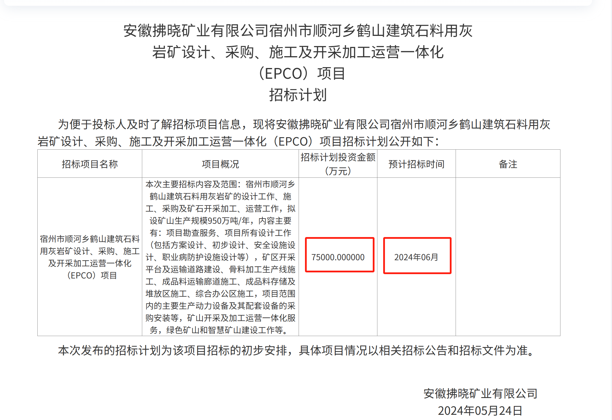 近日,安徽省宿州市公共資源交易中心發(fā)布安徽拂曉礦業(yè)有限公司宿州市順河鄉(xiāng)鶴山建筑石料用灰?guī)r礦設(shè)計(jì)、采購、施工及開采加工運(yùn)營一體化(EPCO)項(xiàng)目招標(biāo)計(jì)劃。該項(xiàng)目招標(biāo)計(jì)劃投資金額7.5億元。預(yù)計(jì)6月招標(biāo)。