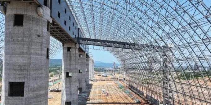 記者在1號煤棚施工點看到,煤棚下部為鋼筋混凝土結(jié)構(gòu),上部為空間網(wǎng)架結(jié)構(gòu)。網(wǎng)架結(jié)構(gòu)形式為正方四角錐螺栓球節(jié)點圓拱形,縱向長度500米,山墻跨度方向100米,建筑面積約5萬平方米,網(wǎng)架主體總重量2900余噸。