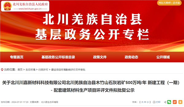 近日,四川省綿陽市北川羌族自治縣人民政府發(fā)布北川川嘉新材料科技有限公司500萬噸/年新建工程(一期)-配套建筑材料生產(chǎn)項目環(huán)評文件擬批復(fù)公示。
