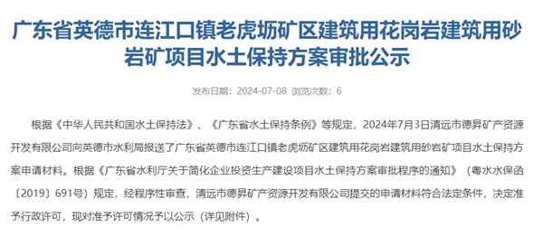 2024年7月8日,廣東清遠(yuǎn)英德市水利局發(fā)布廣東英德連江口鎮(zhèn)老虎壢礦區(qū)建筑用花崗巖建筑用砂巖礦項(xiàng)目水土保持方案通過審批公告。該項(xiàng)目總投資5.64億元,設(shè)計(jì)總生產(chǎn)規(guī)模320萬方/年,施工工期6個(gè)月,建設(shè)單位為清遠(yuǎn)市德昇礦產(chǎn)資源開發(fā)有限公司。