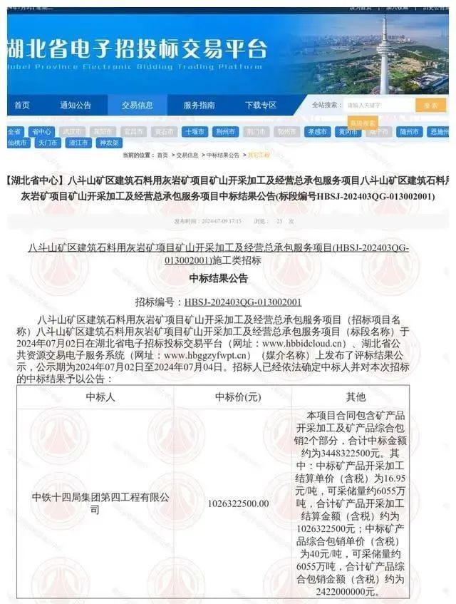 湖北省京山市八斗山礦區(qū)建筑石料用灰?guī)r礦項(xiàng)目礦山開采加工及經(jīng)營(yíng)總承包服務(wù)項(xiàng)目由中鐵十四局第四工程公司中標(biāo),總面積815畝,可采儲(chǔ)量6055萬噸,年設(shè)計(jì)開采500萬噸,合同額34.5億,開采年限13.1年(含基建期1年)。涵蓋開采加工及包銷。
