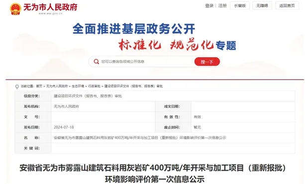 日前,安徽省蕪湖市無為市人民政府發(fā)布霧露山建筑石料用灰?guī)r礦400萬噸/年開采與加工項(xiàng)目(重新報(bào)批)環(huán)境影響評(píng)價(jià)第一次信息公示。