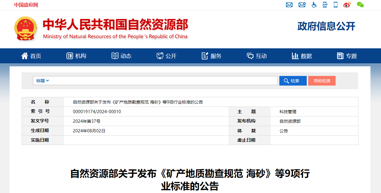 《礦產(chǎn)地質(zhì)勘查規(guī)范 海砂》等9項(xiàng)行業(yè)標(biāo)準(zhǔn)已通過(guò)全國(guó)自然資源與國(guó)土空間規(guī)劃標(biāo)準(zhǔn)化技術(shù)委員會(huì)和全國(guó)珠寶玉石標(biāo)準(zhǔn)化技術(shù)委員會(huì)審查,經(jīng)2024年第5次部長(zhǎng)辦公會(huì)審議通過(guò),現(xiàn)予批準(zhǔn)、發(fā)布,自2024年10月1日起實(shí)施。標(biāo)準(zhǔn)編號(hào)及名稱(chēng)如下: