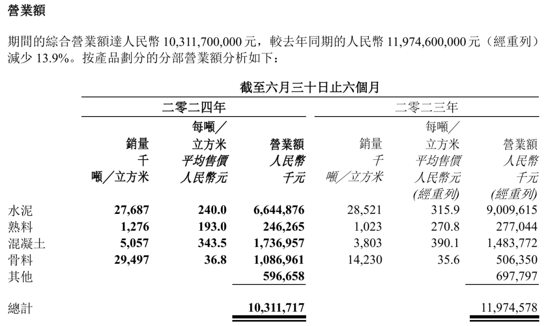 此外,上述商品的價(jià)格大多出現(xiàn)下跌。上半年,水泥、熟料、混凝土及骨料的平均售價(jià)分別為每噸240元、每噸193元、每立方米343.5元及每噸36.8元,分別較去年同期減少24%、減少28.7%、減少11.9%及增加3.4%。
