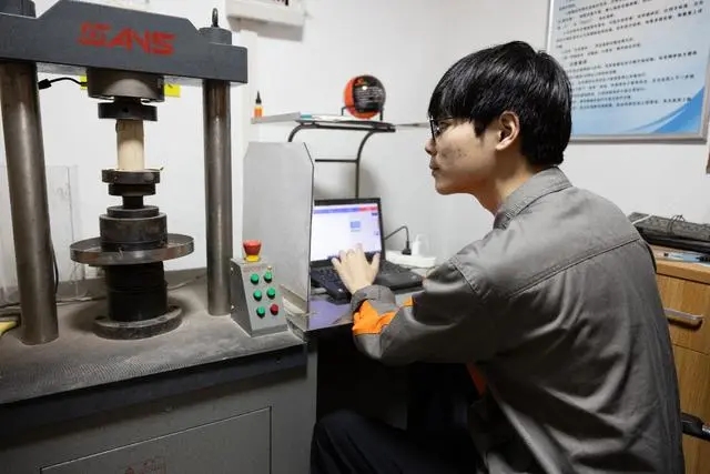 △團(tuán)隊(duì)學(xué)生在實(shí)驗(yàn)室進(jìn)行巖石壓力測試。