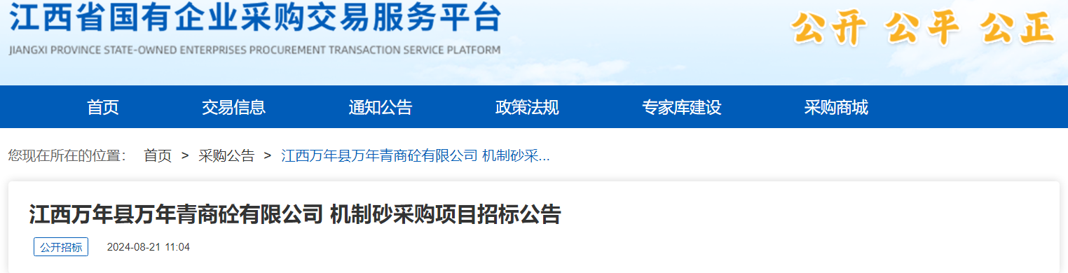 日前,江西萬(wàn)年縣萬(wàn)年青商砼有限公司發(fā)布機(jī)制砂采購(gòu)項(xiàng)目招標(biāo)公告。