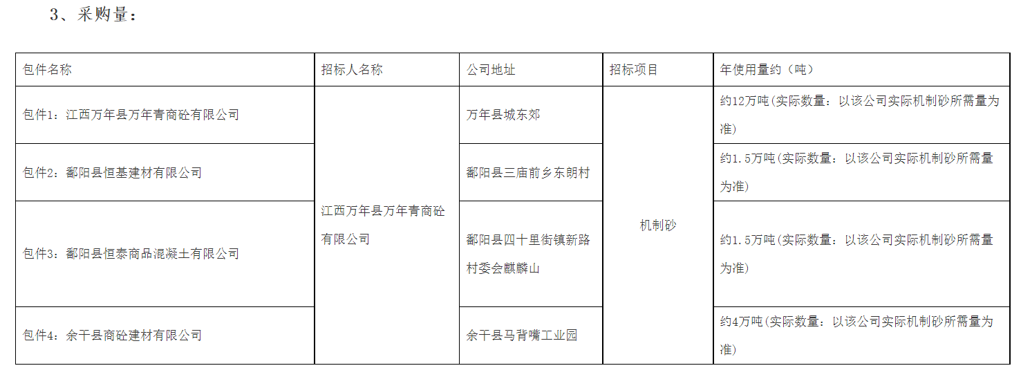 招標(biāo)公告顯示,根據(jù)江西萬(wàn)年青水泥股份有限公司生產(chǎn)經(jīng)營(yíng)管理需要,現(xiàn)公司所屬鷹萬(wàn)區(qū)域商砼企業(yè)鄱陽(yáng)縣恒基建材有限公司、鄱陽(yáng)縣恒泰商品商品混凝土有限公司、余干縣商砼建材有限公司委托江西萬(wàn)年縣萬(wàn)年青商砼有限公司對(duì)生產(chǎn)所需機(jī)制砂采購(gòu)項(xiàng)目進(jìn)行公開招標(biāo),擬選定供應(yīng)單位。定標(biāo)后由委托方與中標(biāo)單位簽訂運(yùn)輸合同,中標(biāo)履約周期為2年。機(jī)制砂采購(gòu)量共計(jì)19萬(wàn)噸。