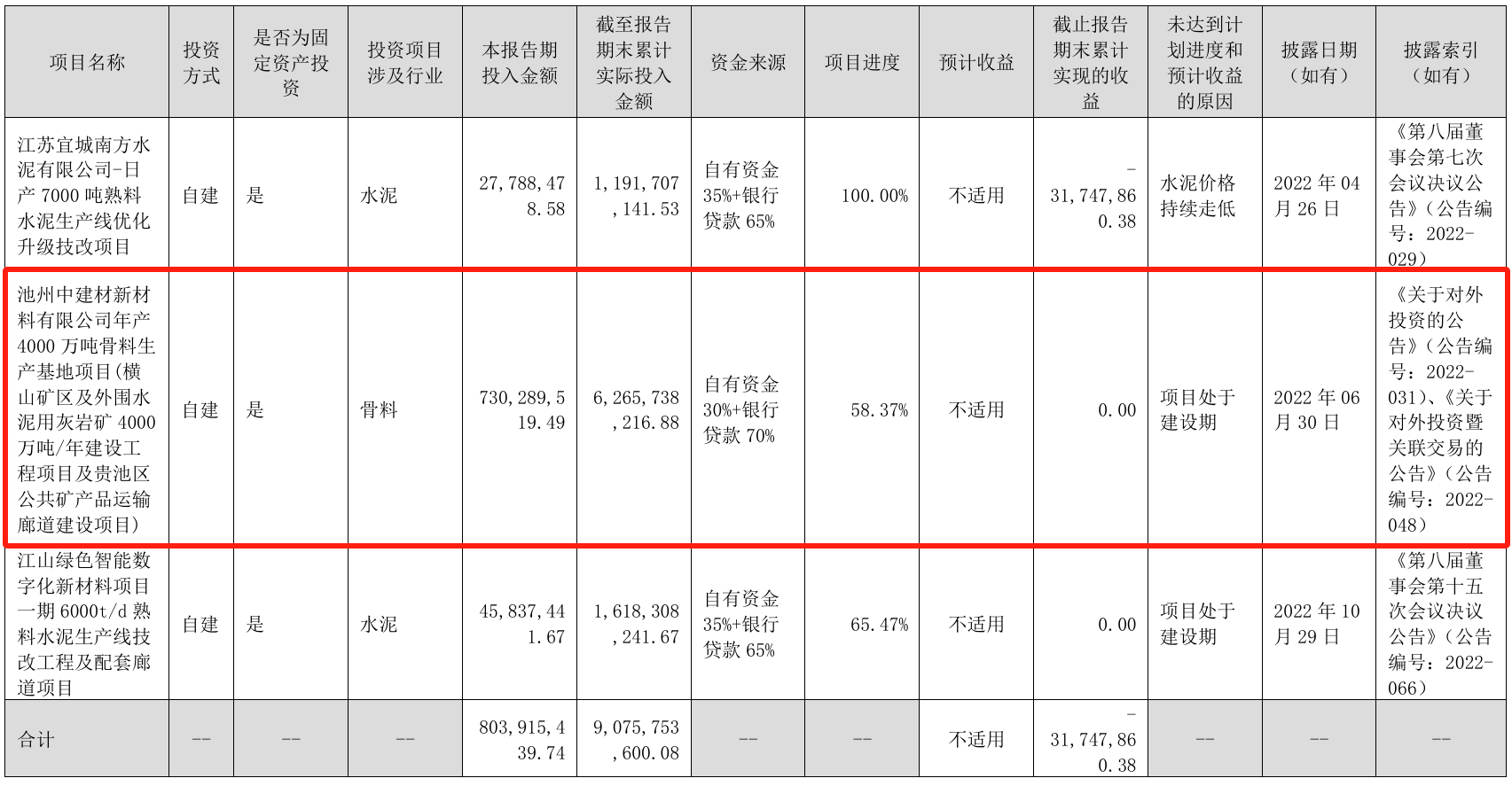 重點(diǎn)項(xiàng)目進(jìn)展:下屬子公司池州中建材新材料有限公司參與競(jìng)買(mǎi)貴池區(qū)橫山礦區(qū)及外圍水泥用灰?guī)r礦采礦權(quán),并投資建設(shè)“池州中建材新材料有限公司年產(chǎn)4000萬(wàn)噸骨料生產(chǎn)基地項(xiàng)目(橫山礦區(qū)及外圍水泥用灰?guī)r礦4000萬(wàn)噸/年建設(shè)工程項(xiàng)目及貴池區(qū)公共礦產(chǎn)品運(yùn)輸廊道建設(shè)項(xiàng)目)”,項(xiàng)目總投資額約 106.13億元。該項(xiàng)目正在建設(shè)實(shí)施,尚未新增產(chǎn)能。根據(jù)半年報(bào)顯示,該項(xiàng)目進(jìn)度已超58%。