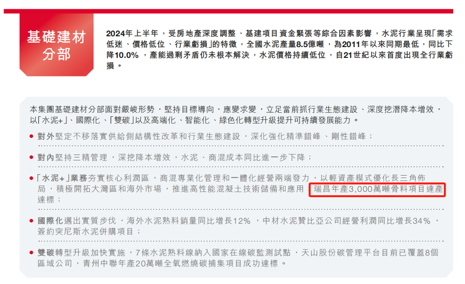 在骨料業(yè)務(wù)方面,上半年骨料銷量6422.4萬噸,相較2023年6930.3萬噸,下降7.3%。骨料平均售價為36.7元/噸,相較于2023年38.9元/噸,下降5.7%。值得關(guān)注的是,中國建材投資建設(shè)的瑞昌年產(chǎn)3000萬噸骨料項目達產(chǎn)達標(biāo)被重點計入本次半年報。