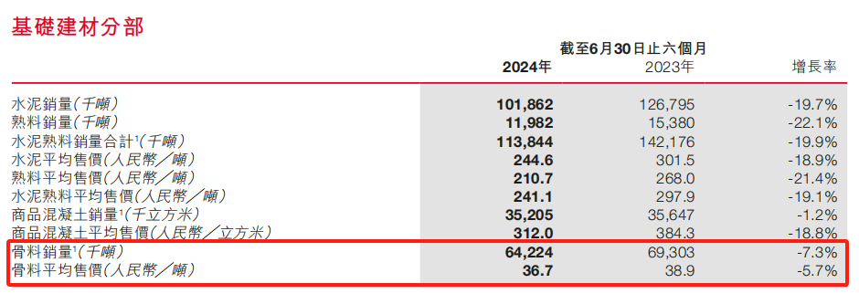 集團基礎(chǔ)建材分部的收入由截至2023年6月30日止六個月的人民幣58748.3百萬元減少至截至2024年6月30日止六個月的人民幣40780.6百萬元,降幅為30.6% ,主要原因是水泥產(chǎn)品、骨料的銷量減少,以及水泥產(chǎn)品、商品混凝土和骨料的平均售價下降。
