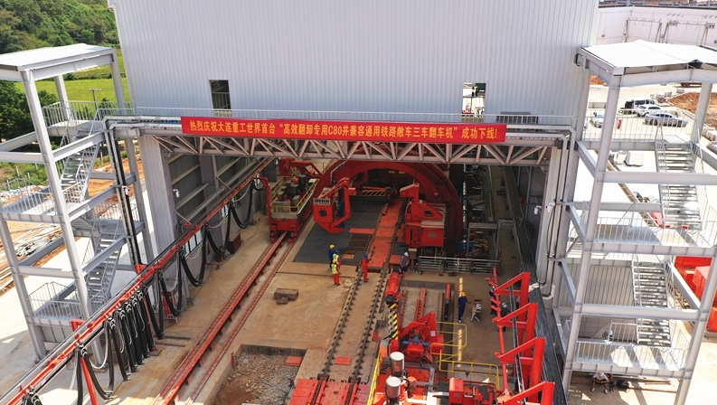 據(jù)了解,該翻車機(jī)是世界首臺(tái)“高效翻卸專用C80并兼容通用鐵路敞車三車翻車機(jī)”,是煤炭物流園翻卸系統(tǒng)的主要機(jī)器,從鐵路專用線接入園區(qū)的煤炭,通過翻卸系統(tǒng),能夠無縫銜接至輸配煤系統(tǒng)及管帶機(jī)系統(tǒng),實(shí)現(xiàn)全程無塵化、低損耗的物料運(yùn)輸。同時(shí)還能緩解交通壓力,有效降低運(yùn)輸成本和碳排放量。