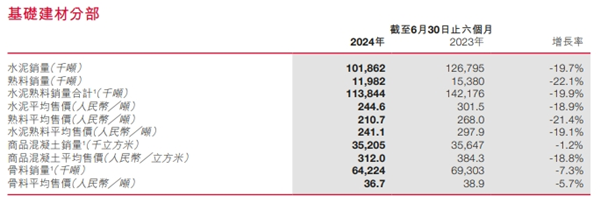 具體來看,基礎(chǔ)建材分部的收入由截至2023年6月30日止六個月的587.48億元減少至截至2024年6月30日止六個月的407.81億元,降幅為30.6%,主要原因是水泥產(chǎn)品、骨料的銷量減少,以及水泥產(chǎn)品、商品混凝土和骨料的平均售價下降。
