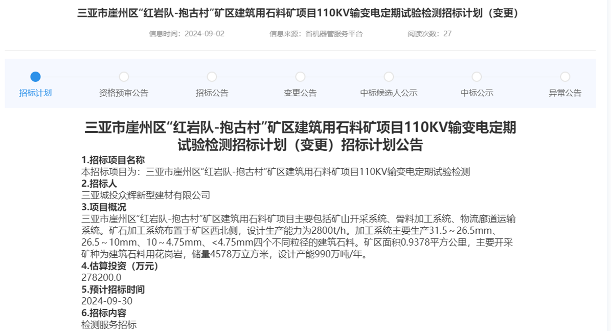 近日,海南省公共資源交易平臺(tái)發(fā)布三亞市崖州區(qū)“紅巖隊(duì)-抱古村”礦區(qū)建筑用石料礦項(xiàng)目110KV輸變電定期試驗(yàn)檢測(cè)招標(biāo)計(jì)劃(變更)招標(biāo)計(jì)劃公告。