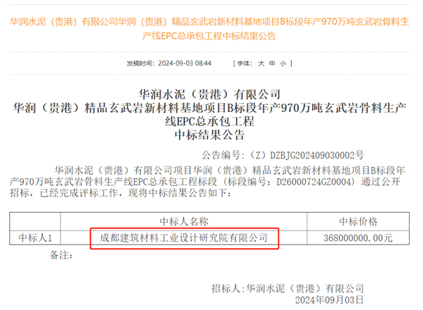 9月3日,成都建筑材料工業(yè)設計研究院有限公司以3.68億元中標華潤(貴港)精品玄武巖新材料基地項目B標段年產(chǎn)970萬噸砂石生產(chǎn)線EPC總承包工程。