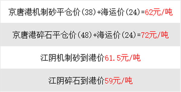 2024年9月3日,京唐港區(qū)機(jī)制砂及碎石平倉價(jià)分別為38元/噸、48元/噸左右,而當(dāng)日京唐港區(qū)到達(dá)江陰地區(qū)2.7-3.5萬噸級(jí)船運(yùn)價(jià)為24元/噸,如此換算,當(dāng)?shù)厣笆系竭_(dá)江陰市場(chǎng)價(jià)格將達(dá)到62-72元/噸。然而,目前江陰市場(chǎng)機(jī)制砂、碎石到港價(jià)格分別為59元/噸、61.5元/噸左右。由此來看,京唐港地區(qū)砂石料到港已遠(yuǎn)超當(dāng)?shù)厥袌?chǎng)平均價(jià)格。