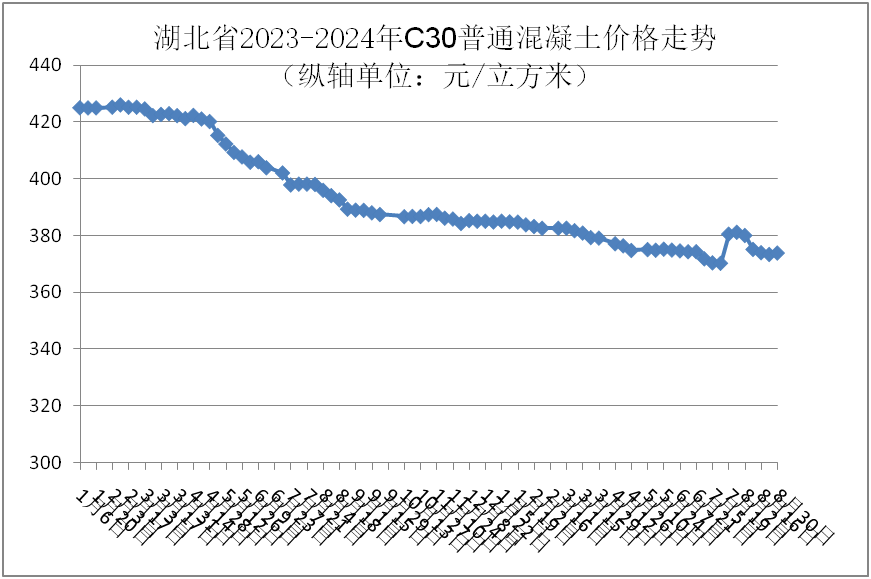 監(jiān)測數(shù)據(jù)顯示:8月份,強(qiáng)度等級C30普通混凝土全省均價為375.38元/立方米,環(huán)比下跌0.13%,同比下跌4.50%。價格走勢情況如下圖: