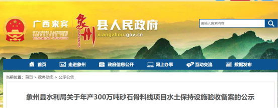 日前,廣西來(lái)賓市象州縣水利局發(fā)布廣西錦象新材料科技有限公司年產(chǎn)300萬(wàn)噸砂石骨料線(xiàn)項(xiàng)目水土保持設(shè)施驗(yàn)收備案的公示。