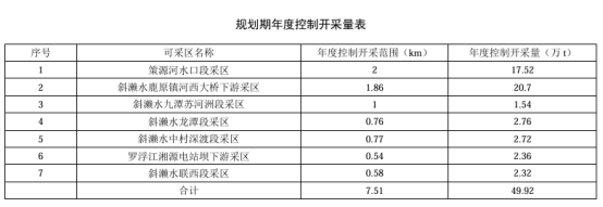 近日,湖南省株洲市炎陵縣人民政府發(fā)布斜瀨水、策源河、羅浮江河道采砂規(guī)劃(2024-2028)。本次規(guī)劃期為4年,劃定了7個(gè)可采區(qū),規(guī)劃采區(qū)內(nèi)保有砂卵石礦資源量655.58萬噸,采砂控制總量249.6萬噸,年度控制開采量49.92萬噸。