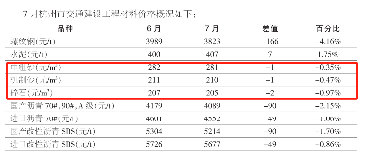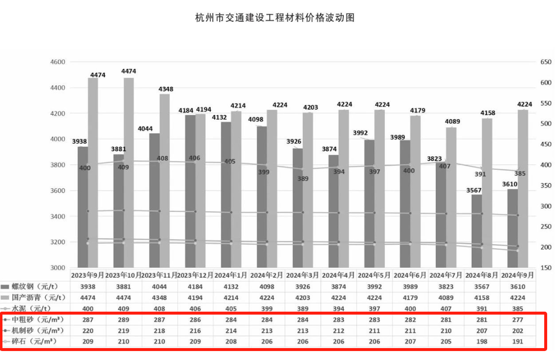 近日,9月份《杭州交通工程造價(jià)管理》發(fā)布并公開了2024年9月杭州交通建設(shè)工程材料價(jià)格。 9月杭州地區(qū)中粗砂277元/m³,較上月下跌4元,環(huán)比跌幅約為1.42%;機(jī)制砂202元/m³,較上月下跌5元..