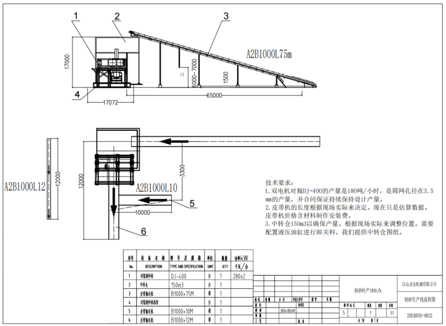 注:1.質(zhì)保要求:除人為或不當(dāng)操作外,電機(jī)、減速機(jī)、輸送帶等質(zhì)保均為二年(輥皮等易損件除外);2.所有皮帶長(zhǎng)度、角度視現(xiàn)場(chǎng)情況來(lái)確定。