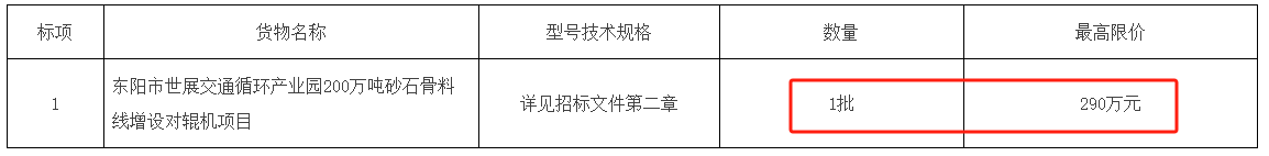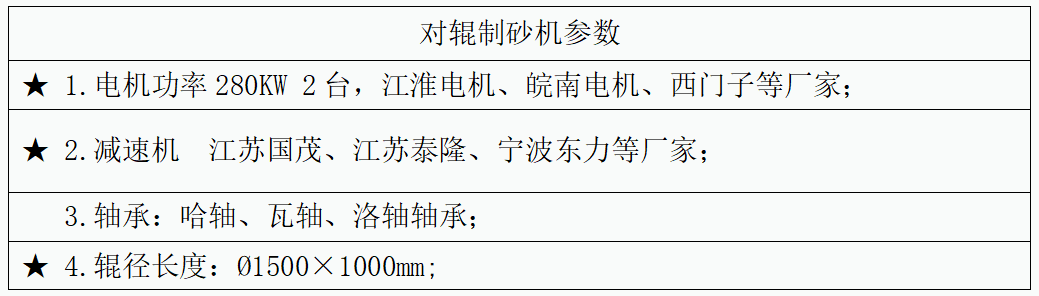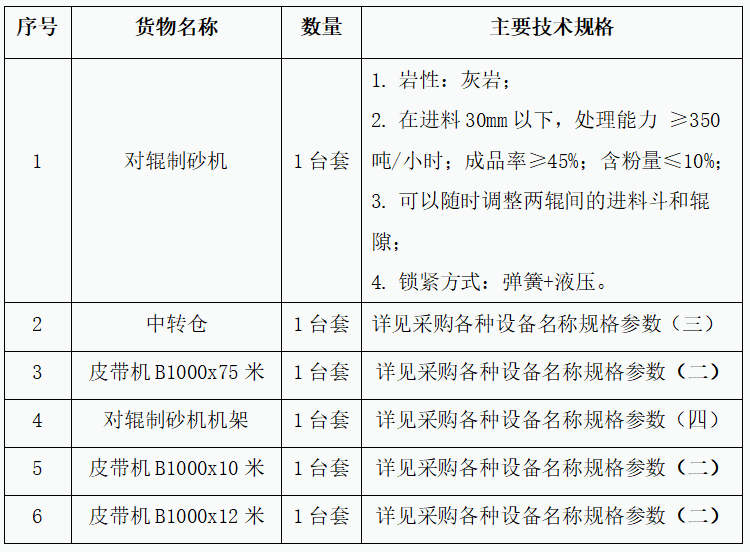 主要采購(gòu)對(duì)輥制砂機(jī)1臺(tái)、皮帶機(jī)3臺(tái)、中轉(zhuǎn)倉(cāng)1套、對(duì)輥機(jī)機(jī)架1套等,最高限價(jià)290萬(wàn)元。