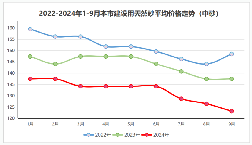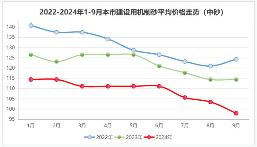 2024年第三季度本市建設用天然砂中砂龍吳路調(diào)研均價115元/噸,攪拌站開票結(jié)算均價127元/噸,同比2023年第三季度天然砂價格下降8.7%;機制砂中砂龍吳路調(diào)研均價93元/噸,攪拌站開票結(jié)算均價102元/噸,同比2023年第三季度機制砂價格下降11.4%。