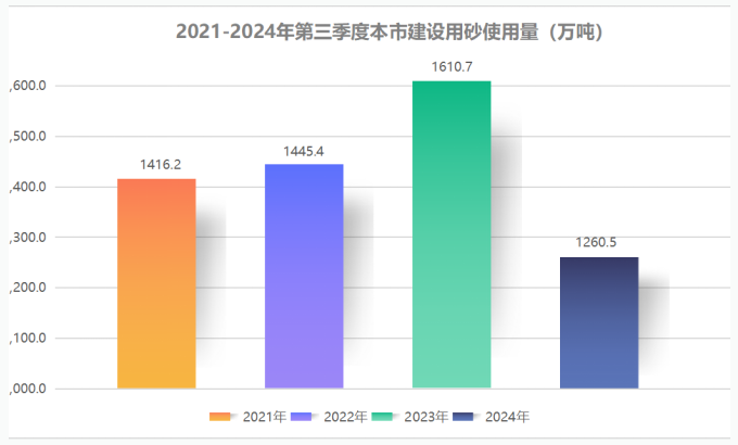 2、2024年第三季度本市建設用砂合計使用量1260.5萬噸,同比2023年三季度的使用量1610.7萬噸,減少了21.7%。2024年1~3季度本市建設用砂合計使用量3711.3萬噸,同比2023年1~3季度的使用量減少了13.6%。