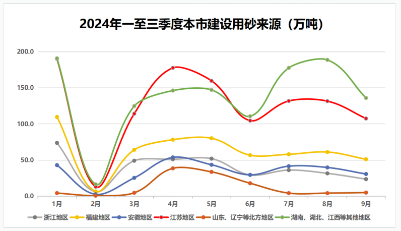 從2024年三季度本市建設用砂來源于進滬運輸便捷的長江沿線地區(qū)和同樣具備內(nèi)河和海運條件的砂源交易聚集地江蘇,其中湖南、湖北、江西等其他地區(qū)占比最高,達40%,江蘇地區(qū)(其中部分為經(jīng)江蘇地區(qū)交易)占29%,福建地區(qū)占14%,安徽地區(qū)占9%,浙江地區(qū)占7%,山東、遼寧等北方地區(qū)供應最少。