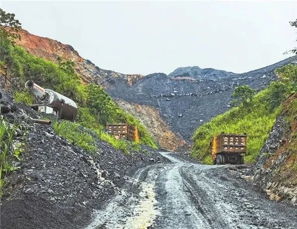 在大浦村與礦山連通的道路上,可以看到,路面坑坑洼洼,并有不少積水,滿載砂石的貨車不時呼嘯而過,騎車人或行人躲閃不及,被濺一身泥水。而在礦山作業(yè)區(qū),整個黑色山體裸露在外,未見復綠跡象,多臺挖掘機正在山頂、山腰同時作業(yè),一輛輛重型貨車排隊等待裝載礦石,道路兩旁撒漏的砂石經(jīng)風吹、碾壓和雨水沖刷,堆積在道路兩側,路邊樹上覆蓋著厚厚塵土,一些樹枝都被壓彎了。