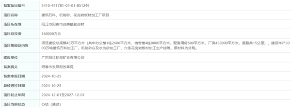 近日,廣東陽春建筑石料、機(jī)制砂、花崗巖板材加工廠項(xiàng)目順利完成項(xiàng)目備案。該項(xiàng)目總投資16億元,年產(chǎn)規(guī)模3000萬噸,建設(shè)單位為廣東陽江輪崗礦業(yè)有限公司,起止年限為2024年12月1日至2027年12月1日。