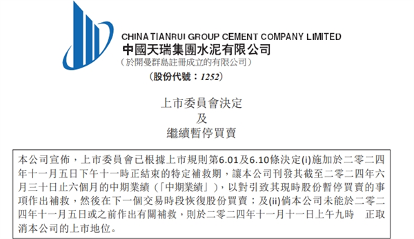 10月27日晚間,天瑞水泥發(fā)布上市委員會(huì)決定及繼續(xù)暫停買賣公告指出,上市委員會(huì)已決定施加于11月5日下午11時(shí)正結(jié)束的特定補(bǔ)救期,讓公司刊發(fā)其截至2024年6月30日止6個(gè)月的中期業(yè)績,以對(duì)引致其現(xiàn)時(shí)股份暫停買賣的事項(xiàng)作出補(bǔ)救,然后在下一個(gè)交易時(shí)段恢復(fù)股份買賣;及倘公司未能于11月5日或之前作出有關(guān)補(bǔ)救,則于11月11日上午9時(shí)正取消公司的上市地位。
