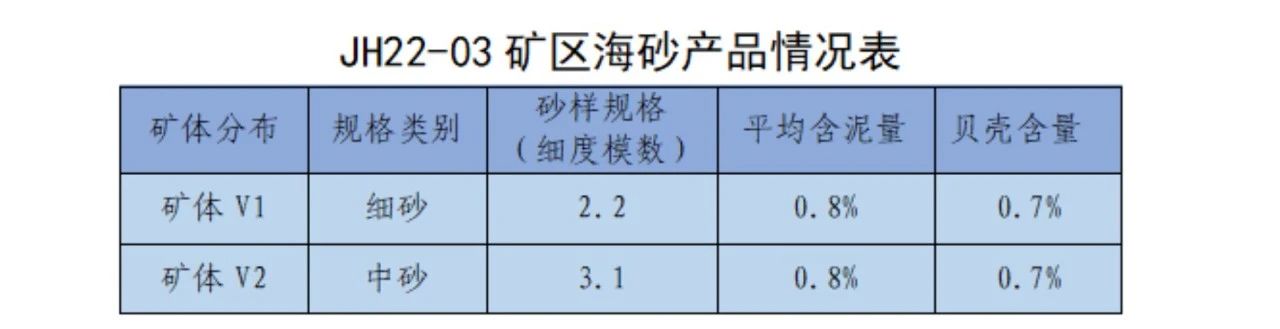 JH22-03礦區(qū)面積1.95km2,深度分V1、V2兩個礦體,V1礦體平均厚度5.39m,主要為特細(xì)砂,砂+礫含量為:69.84%~89.09%;V2礦體平均厚度8.92m,主要為中砂,其次為粗砂,砂+礫含量為:78.06%~90.52%。