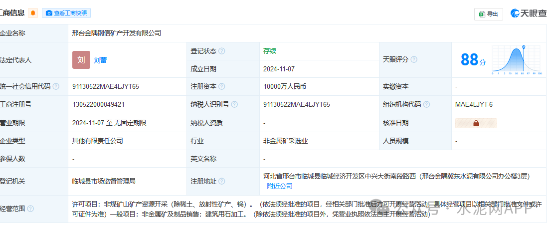 近日,邢臺(tái)金隅鋼信礦產(chǎn)開(kāi)發(fā)有限公司成立,法定代表人為劉蕾,注冊(cè)資本為1億元。經(jīng)營(yíng)范圍包含:非煤礦山礦產(chǎn)資源開(kāi)采;非金屬礦及制品銷售;建筑用石加工等。