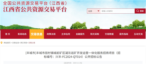 11月20日,江西省公共資源交易平臺發(fā)布豐城市麗村鎮(zhèn)城前礦區(qū)凝灰?guī)r礦開發(fā)運營一體化服務招商項目公開招標,投標截止時間為2024年12月11日。成交投資商對該項目建設的資金投入應不低于5000萬元。