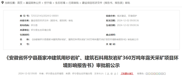 12月2日,安徽省安慶市懷寧縣人民政府發(fā)布聶家沖建筑用砂巖礦、建筑石料用灰?guī)r礦360萬噸年露天采礦項(xiàng)目環(huán)評審批前公示。