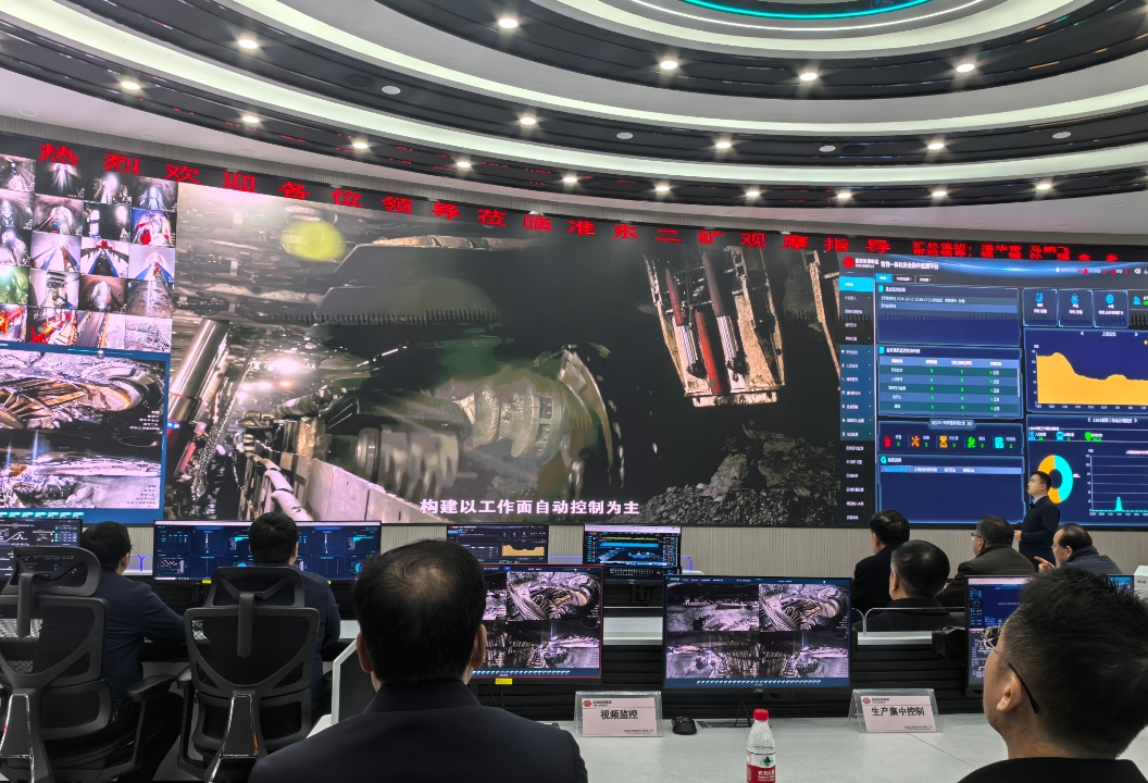 12月10日,在國網(wǎng)能源新疆準(zhǔn)東煤電有限公司準(zhǔn)東煤田大井礦區(qū)二號(hào)礦井智控中心,通過大屏可清楚地看到井下采煤情況。