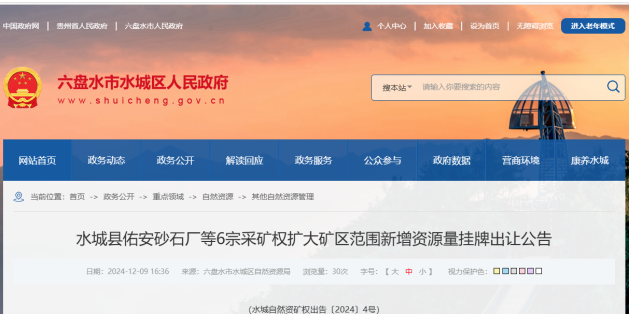 日前,貴州省六盤水市人民政府發(fā)布水城縣佑安砂石廠等6宗采礦權(quán)擴大礦區(qū)范圍新增資源量掛牌出讓公告。據(jù)悉,6宗采礦權(quán)可采資源儲量共計約1.06億噸,合計產(chǎn)能1035萬噸/年,出讓年限均為10年,起拍總價為1092.62萬元。掛牌起止時間在2025年1月9日9時至2025年1月23日15時30分。