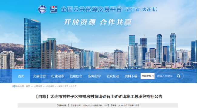 近日,遼寧省大連市公共資源交易平臺發(fā)布當?shù)馗示訁^(qū)拉樹房村黃山砂石土礦礦山施工總承包招標公告。該項目招標業(yè)主為大連空港礦業(yè)發(fā)展有限公司,本次招標開采量約3400萬方,年開采能力1400..