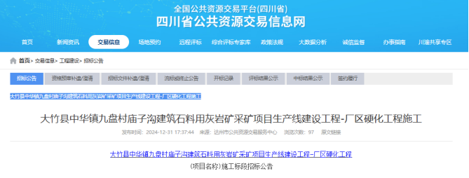 日前,四川省達(dá)州市公共資源交易服務(wù)中心發(fā)布大竹縣中華鎮(zhèn)九盤村廟子溝建筑石料用灰?guī)r礦采礦項(xiàng)目生產(chǎn)線建設(shè)工程-廠區(qū)硬化工程施工標(biāo)段招標(biāo)公告。該項(xiàng)目設(shè)計(jì)開(kāi)采規(guī)模300萬(wàn)噸/年建筑石料用灰?guī)r,業(yè)主為大竹縣金穗源農(nóng)林發(fā)展有限公司,施工標(biāo)段計(jì)劃工期為120日歷天。